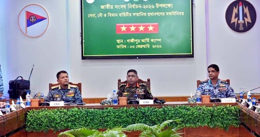 ত্রয়োদশ জাতীয় সংসদ নির্বাচন ও গণভোট-২০২৬কে সামনে রেখে গাজীপুরে সেনা, নৌ ও বিমান বাহিনী প্রধানদের এক মতবিনিময়সভার আয়োজন করা হয়েছে। মঙ্গলবার (৩ ফেব্রুয়ারি ২০২৬) বাংলাদেশ ধান গবেষণা ইনস্টিটিউটের সম্মেলনকক্ষে ...